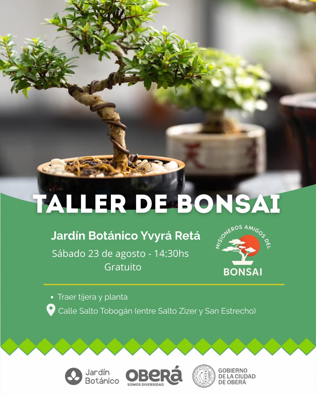 La actividad, organizada por la Dirección de Turismo, Recreación y Cultura del Gobierno de la Ciudad de Oberá en colaboración con el Grupo Misioneros Amigos del Bonsái, está pensada para toda la familia. La iniciativa busca acercar a obereños y turistas a la belleza y paciencia del arte del bonsái. Para garantizar la seguridad, se solicita que las infancias que quieran participar asistan acompañados por un adulto responsable, debido al manejo de tijeras durante el taller.